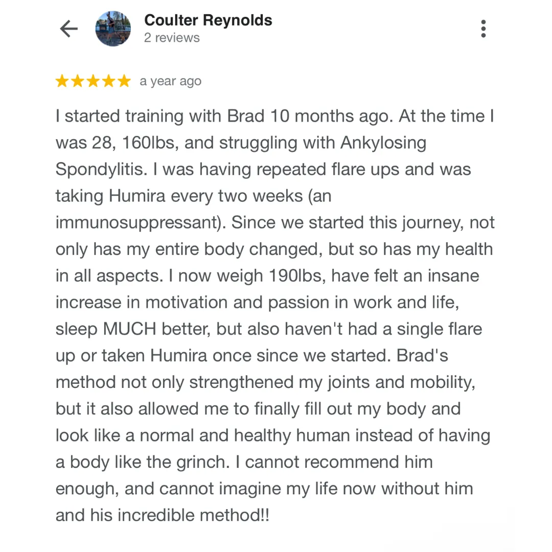 When Coulter Reynolds first came to me, he was a 28-year-old man grappling with the debilitating condition of Ankylosing Spondylitis. At 160 pounds and on a regimen of Humira injections every two weeks, Coulter's situation was far from ideal. His flare-ups were frequent, and the disease was taking a toll on his physical and emotional well-being. His objective was to not just manage his condition but to thrive, by increasing his weight and improving his overall health and life.