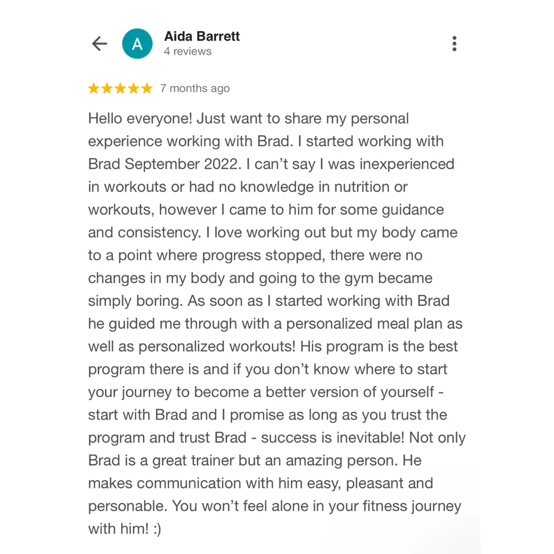 In just a few months of working together, Aida broke through her fitness plateau, which had been hindering her for quite some time. But it wasn't just the visible changes in her body that marked her success; it was also the revitalization of her love for working out. She no longer saw the gym as a boring place but as a playground for growth and transformation. Furthermore, our open and personable line of communication made the journey even more fulfilling for her.